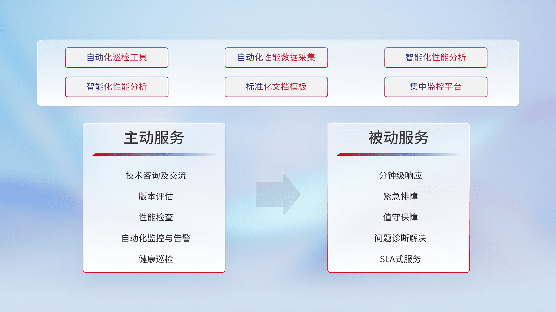 智能化工具和标准化文档,,,保障服务质量,,提供主动服务(包含技术咨询、、版本评估、、性能检查、、、、自动化监控与告警、、健康巡检)和被动服务包含(分钟级响应、、、紧急排障、、、值守保障、、、问题诊断解决、、、SLA服务)。。